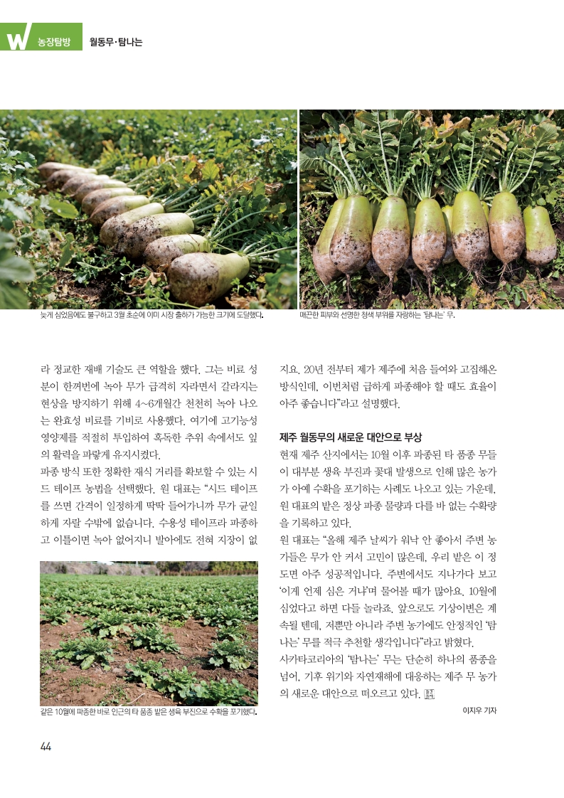원 대표는 “올해 제주 날씨가 워낙 안 좋아서 주변 농가들은 무가 안 커서 고민이 많은데, 우리 밭은 이 정도면 아주 성공적입니다. 주변에서도 지나가다 보고 ‘이게 언제 심은 거냐’며 물어볼 때가 많아요. 10월에 심었다고 하면 다들 놀라죠. 앞으로도 기상이변은 계속될 텐데, 저뿐만 아니라 주변 농가에도 안정적인 ‘탐나는’ 무를 적극 추천할 생각입니다”라고 밝혔다.