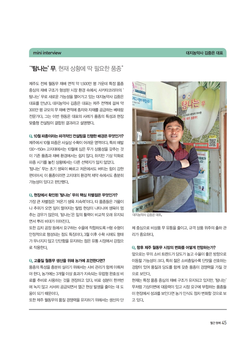 사카타코리아의 ‘탐나는’ 무는 단순히 하나의 품종을 넘어, 기후 위기와 자연재해에 대응하는 제주 무 농가의 새로운 대안으로 떠오르고 있다.