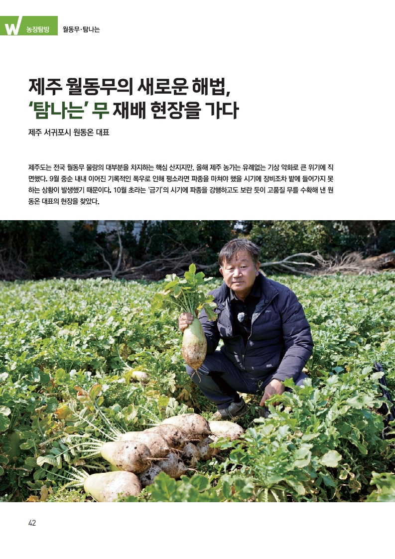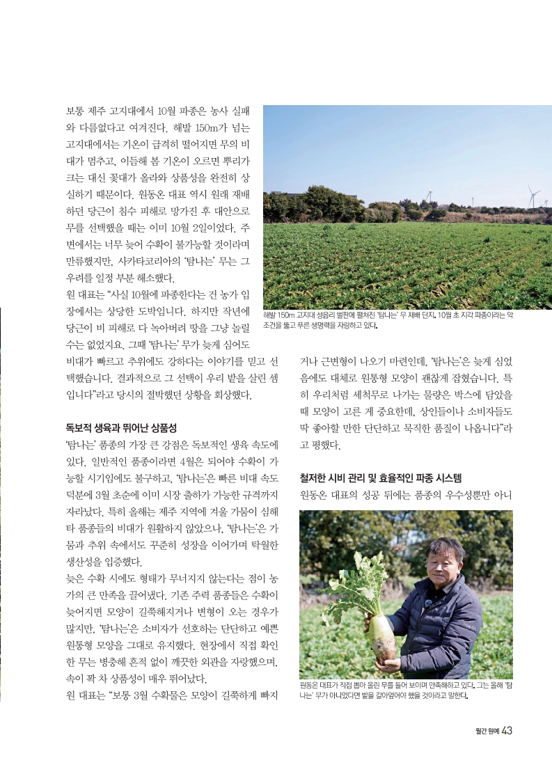 제주도는 전국 월동무 물량의 대부분을 차지하는 핵심 산지지만, 올해 제주 농가는 유례없는 기상 악화로 큰 위기에 직면했다. 9월 중순 내내 이어진 기록적인 폭우로 인해 평소라면 파종을 마쳐야 했을 시기에 장비조차 밭에 들어가지 못하는 상황이 발생했기 때문이다. 10월 초라는 ‘금기’의 시기에 파종을 강행하고도 보란 듯이 고품질 무를 수확해 낸 원동온 대표의 현장을 찾았다. 보통 제주 고지대에서 10월 파종은 농사 실패와 다름없다고 여겨진다. 해발 150m가 넘는 고지대에서는 기온이 급격히 떨어지면 무의 비대가 멈추고, 이듬해 봄 기온이 오르면 뿌리가 크는 대신 꽃대가 올라와 상품성을 완전히 상실하기 때문이다. 원동온 대표 역시 원래 재배하던 당근이 침수 피해로 망가진 후 대안으로 무를 선택했을 때는 이미 10월 2일이었다. 주변에서는 너무 늦어 수확이 불가능할 것이라며 만류했지만, 사카타코리아의 ‘탐나는’ 무는 그 우려를 일정 부분 해소했다.